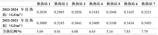 采集了真实案例项目2023-2024年度供热期的单位面积耗热量,并与采用传统调控策略的历史同期值进行了比较。结果表明,本期热耗较同期值均有不同程度的降低。降幅最大达到8.01%,最小为5.16%,各换热站平均降幅为6.74%。