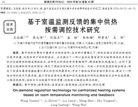 王延敏,李志伟,刘俊杰,等. 基于室温监测反馈的集中供热按需调控技术研究[J]. 暖通空调, 2024,54(10):44-51. DOI:10.19991/j.hvac1971.2024.10.07.
