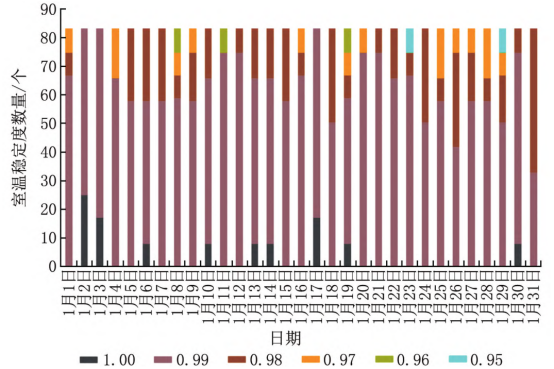计算了案例项目一个换热站2024年1月每日的室温稳定度。在总计2573个数据中,有1855个值显示室温稳定度高达0.99,占比达到72.09%,充分展现了室温的优异稳定性;其余数据虽然略低,但也均保持在0.95以上,进一步印证了室温波动幅度较小,整体表现出良好的稳定性。