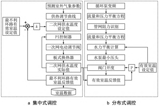 建筑物功能混合的换热站需要实现分区控制,通常具有多个管网环路,如果环路上没有可调节阀门,其调控策略为集中式调控,类似单一调控策略,有效室温取自最不利环路上建筑物的室温。如果每个环路上都有阀门,可采用分布式调控,原理是依据每个环路的有效室温来控制阀门开度。分布式调控策略通过为每个环路设置不同时间段的有效室温,实现分时分区控制。