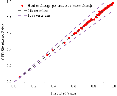 在数值模拟得到的144组数据中,80%用于训练,20%用于测试模型性能。通过归一化后的数据测试模型,结果表明预测值与模拟值的误差大多数在10%以内,表明模型具有较好的准确性。随后,采用遗传算法优化换热器结构,优化后的冷梁单位面积换热量比未优化的提高了30.64%,比现有冷梁提高了20.48%。